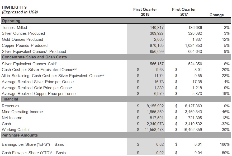 Silver equivalent production for the first quarter of 2018 increased by 9% to 656,699 oz1 compared to 604,643 oz1 in the first quarter of 2017. Silver production for the first quarter of 2018 decreased 3% to 309,927oz compared to 320,082 oz in the first quarter of 2017. Gold production for the first quarter of 2018 increased by 12% to 2,065 oz compared to 1,837 oz in the corresponding period of 2017. Copper production decreased by 5% to 970,165 lbs compared to 1,024,853 lbs in the first quarter of 2017. Total mill feed processed during the first quarter of 2018 was 140,817 dry tonnes compared to 136,686 dry tonnes during the first quarter of 2017, a increase of 3%.