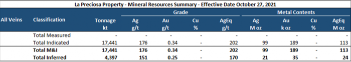 - Mineral resources for La Preciosa are estimated at a cut-off grade of 120 g/t AgEq.