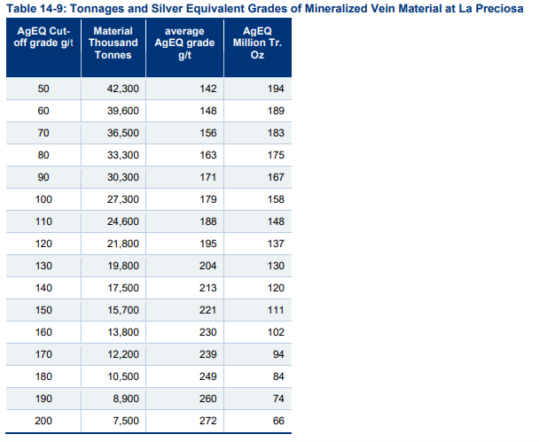 A table disclosing tonnage, average AgEq grade and total AgEq ounces at a variety of cut-off grades can be found below and in the report as filed on SEDAR.