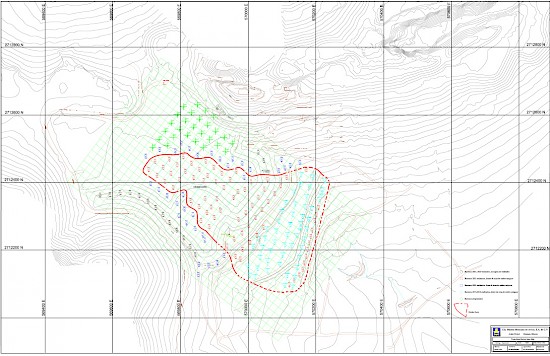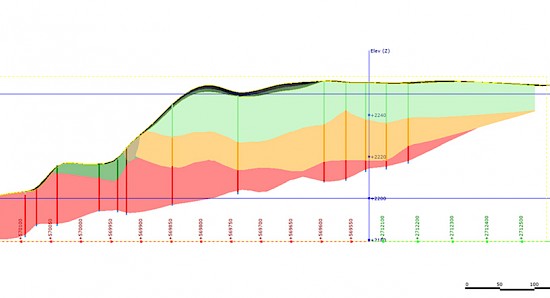 Figure 2 shows the longitudinal section of the oxide tailings with the red material being the Historic oxides, the orange being the Recent Oxides and the green being the Sulphide Zone. Two small units of Historic Sulphides (dark green) and remnants of erosion control rock (brown) are present above the Historic Oxide Zone on the southeast slope. The vertical scale of the section has been exaggerated by a factor of 3 to better illustrate the geometry of the deposit.