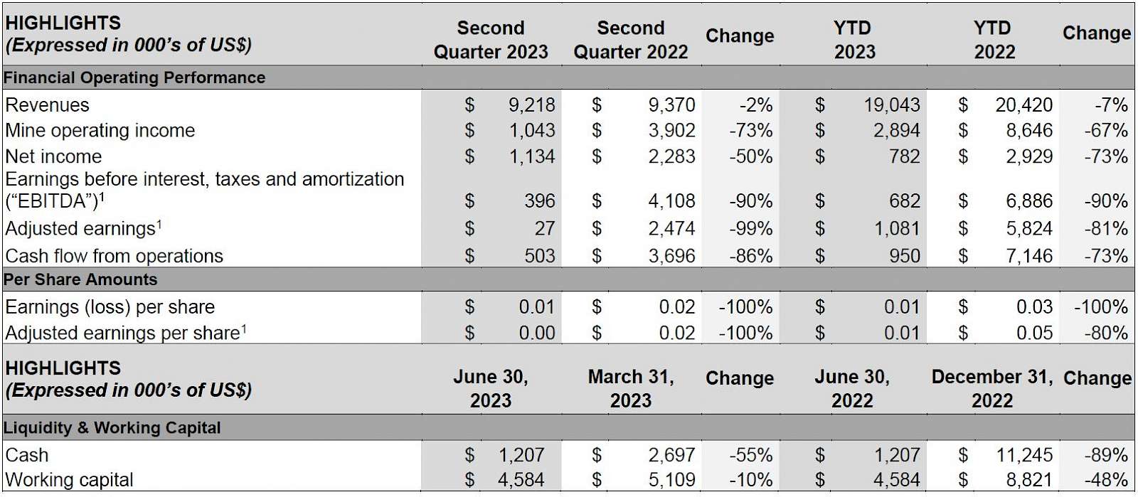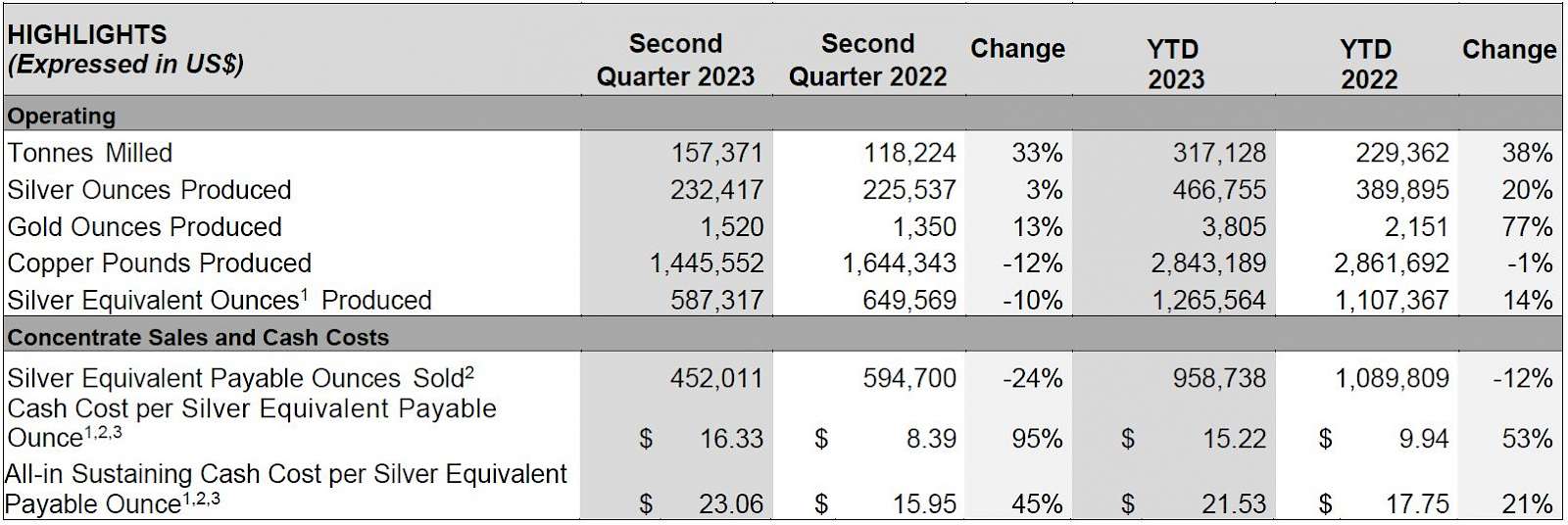 - In Q2 2023, AgEq was calculated using metals prices of $24.18 oz Ag, $1,978 oz Au and $3.85 lb Cu. In Q2 2022, AgEq was calculated using metals prices of $22.64 oz Ag, $1,873 oz Au and $4.32 lb Cu. For YTD 2023, AgEq was calculated using metals prices of $23.37 oz Ag, $1,933 oz Au and $3.95 lb Cu. For YTD 2022, AgEq was calculated using metal prices of $23.29 oz Ag, $1,873 oz Au and $4.43 lb Cu. Calculated figures may not add up due to rounding.