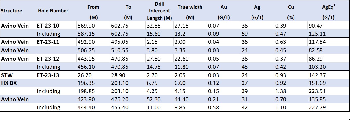 - Hole ET 23-10: 0.39 % Cu, 36 Ag g/t and 0.07 Au g/t over 27.15 metres true width