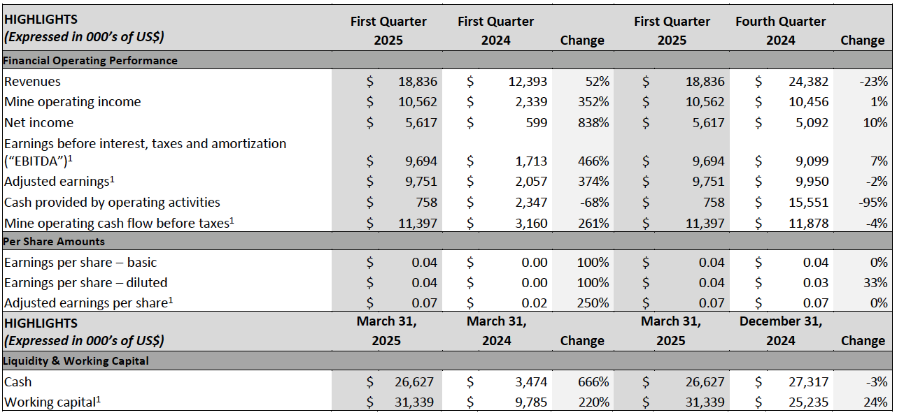 - Increased Working Capital from Cash Flow Prior to Working Capital Movements: The Company’s balance sheet continued to strengthen with working capital1 increasing to $31.3 million, up $6.1 million, or 24% from $25.2 million at the end of 2024, as a result of another quarter of cash generation. Cash provided by operating activities of $0.8 million was impacted by working capital movements, with $6.6 million in working capital movements, primarily in increases to amounts receivable from sales, concentrate and stockpile inventory, as well as income tax payments in Mexico during the quarter. Prior to working capital movements, cash generated from operating activities was $7.4 million, or $0.05 per share.