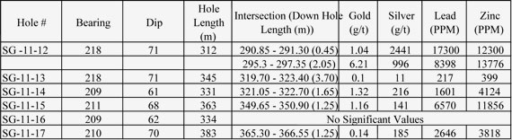 As shown in the longitudinal section on the website, Avino drilled forty holes at San Gonzalo in 2007, seven in 2008, eleven in Feb/Mar 2011 as well as the six holes in Oct/Nov 2011 reported above which explored areas of the San Gonzalo vein between intersections in 2007 and 2008 holes.