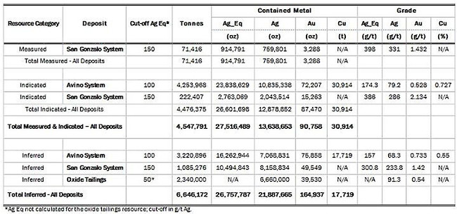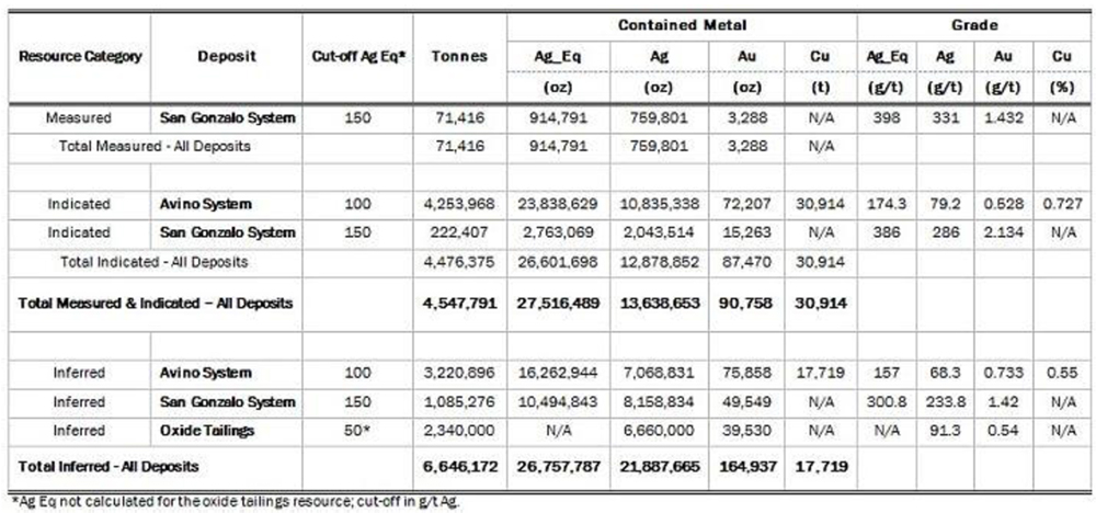“We are very pleased with the results of this study. We’ve substantially increased the resource at San Gonzalo and have the first ever mineral resource estimate on the main Avino Mine. The Avino property has an extensive mining history; with this new resource estimate and our improving exploration capabilities, Avino is poised to continue that legacy into the foreseeable future”