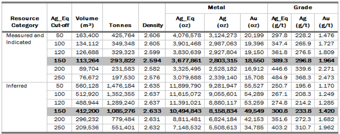 - A measured and indicated silver resource of 293,823 tonnes at an average grade of 297 g/t silver and 1.98 g/t gold totaling 2,803,315 troy ounces of silver and 18,551 troy ounces of gold using a base case cut-off grade of 150 g/t silver equivalent.