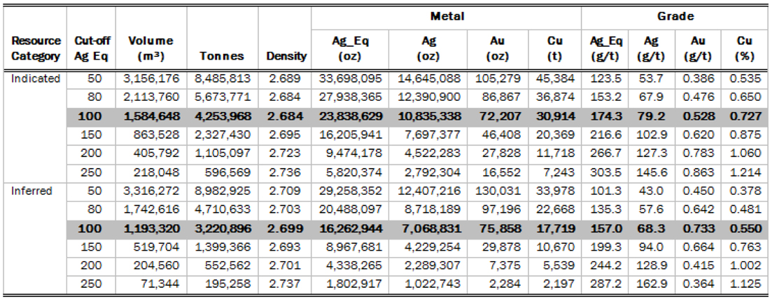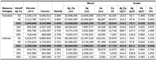 - An indicated silver resource of 4,253,968 tonnes at an average grade of 79.2 g/t silver, 0.528 g/t gold and 0.727% copper totaling 10,835,338 troy ounces of silver, 72,207 troy ounces of gold and 30,914 tonnes copper using a base case cut-off grade of 100 g/t silver equivalent.