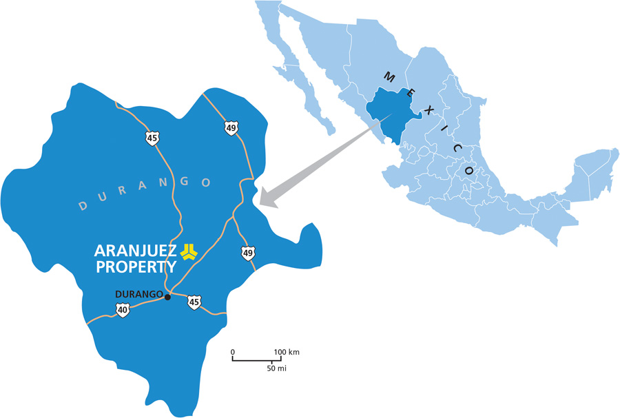 The Aranjuez property is located 6 km west of the Avino Mine and approximately 2 km north of the Santa Monica property, formerly of Orko Silver Corp.